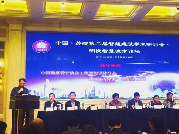 2017年11月3日,中国·苏皖第二届智能建筑学术研讨会明发智慧城市论坛在南京明发国际大酒店召开。参加研讨会的嘉宾有中国勘察设计协会智能设计工程分会会长胡萍,《数据中心数据规范》标准编写组组长钟景华,中国勘察设计协会智能设计工程分会湖北省专家委员会主任熊江、安徽省专家委员会主任万力、山东省专家委员会主任张钊、江苏省专家委员会主任管清宝,江苏k8凯发科技集团有限公司执行董事陈俊桦及集团副总经理吴雪峰等近300多人参加了研讨会。