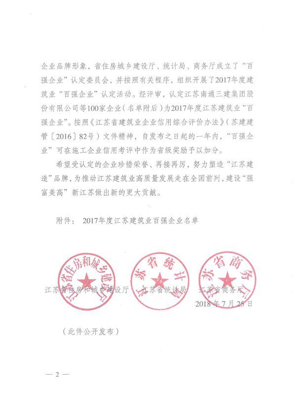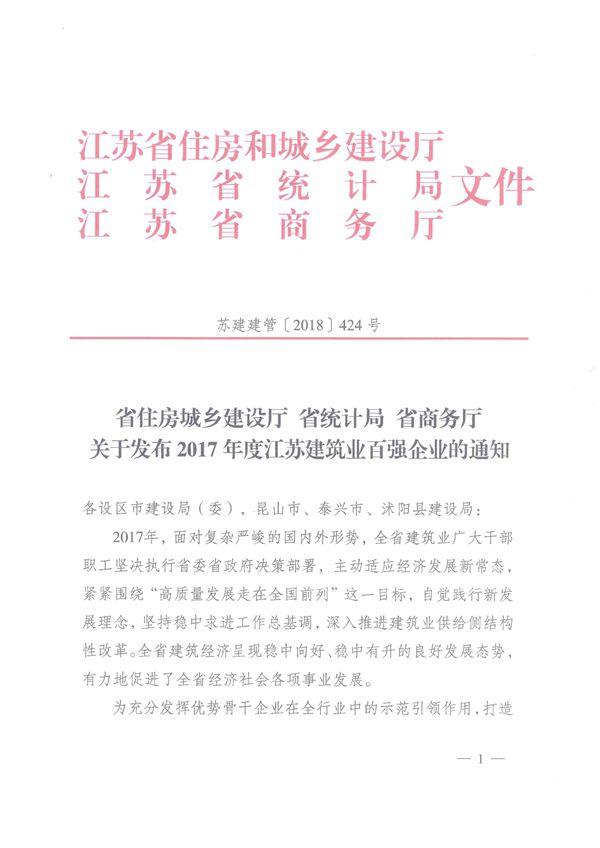 近日,江苏省住房城乡建设厅、江苏省统计局、江苏省商务厅联合发布2017年度全省建筑业“百强企业”名单,江苏k8凯发科技集团有限公司以出色的成绩荣登百强企业榜单。