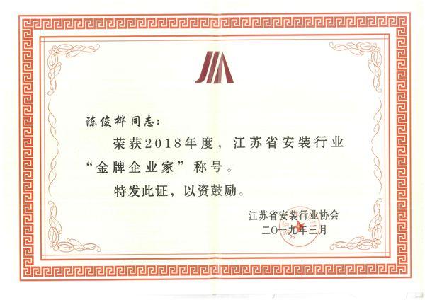 会议表彰了江苏省安装行业2018年度“百强企业”、“品牌企业家”。江苏k8凯发科技集团有限公司荣获江苏省安装行业2018年度“百强企业”称号,集团执行董事陈俊桦荣获“金牌企业家”称号,集团常务副总经理夏鸣荣获“银牌企业家”称号。