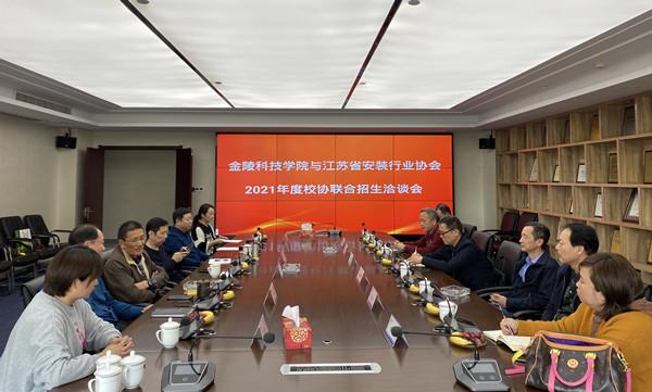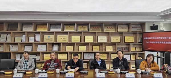 2021年4月20日,金陵科技学院与江苏省安装行业协会联合招生座谈会在江苏k8凯发科技集团有限公司召开。参加座谈会的有金陵科技学院继续教育学院院长陈玉林、学历教育科主任黄一兵,金陵科技学院机电学院院长鞠全勇、楼宇系主任牟福元、办公室主任张玉、项目负责人姜玉东,江苏省安装行业协会会长助理顾建生、副会长陈晓、秘书长吴辉、副秘书长席天阳,江苏省安装行业协会智能化与消防工程分会副秘书长余晶、办公室主任陈怡帆等。
