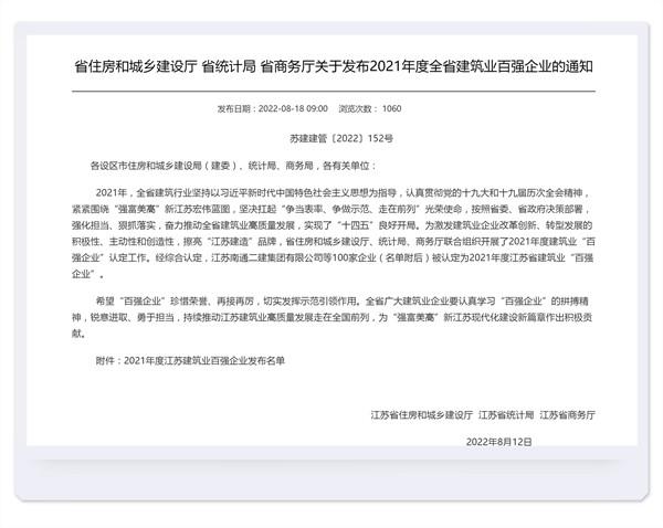 2022年8月18日,江苏省住房和城乡建设厅、江苏省统计局、江苏省商务厅发布了2021年度江苏省建筑业百强企业的通知,江苏k8凯发科技集团有限公司荣获2021年度江苏省建筑业“百强企业”称号。