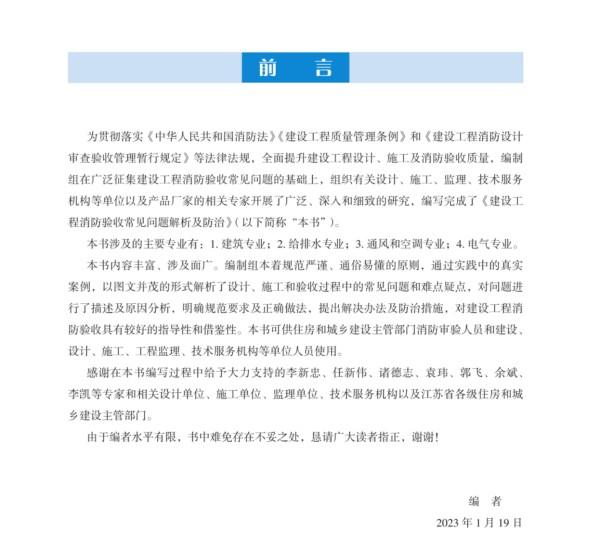为贯彻落实《中华人民共和国消防法》《建设工程质量管理条例》和《建设工程消防设计审查验收管理暂行规定》等法律法规,全面提升建设工程设计、施工及消防验收质量,编制组结合最新的《建筑防火通用规范》GB 55037—2022、《消防设施通用规范》GB 55036—2022等标准规范,在广泛征集建设工程消防验收常见问题的基础上,组织有关设计、施工、监理、技术服务机构等单位以及产品厂家的相关专家开展了广泛、深入和细致的研究,编写完成了《建设工程消防验收常见问题解析及防治》(以下简称“本书”)。