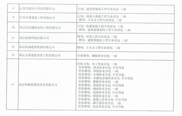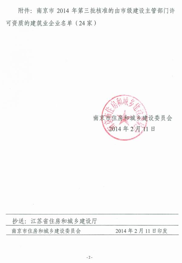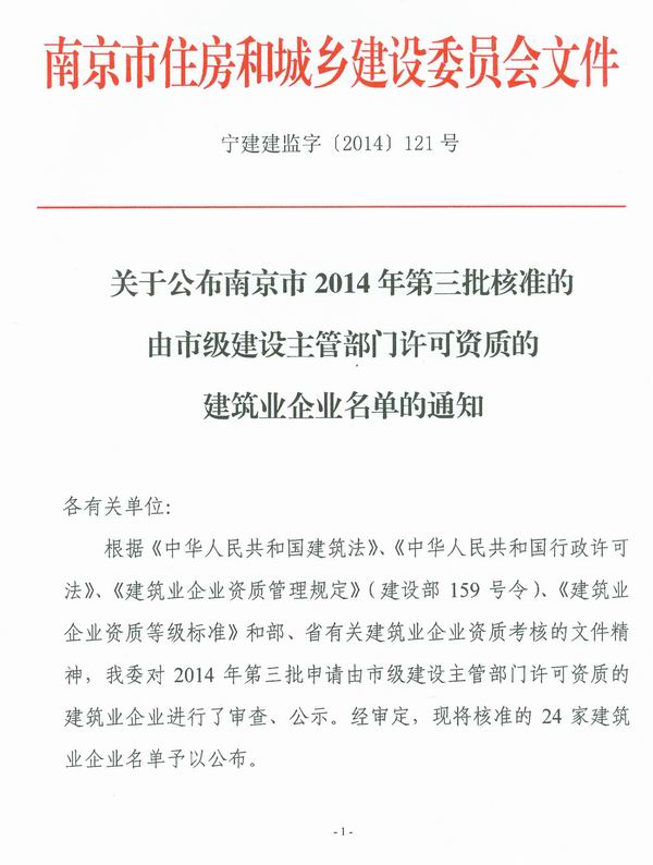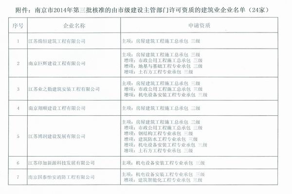 关于公布南京市2014年第三批核准的由市级建设主管部门许可资质的建筑业企业名单的通知