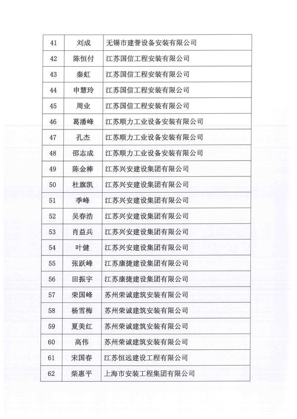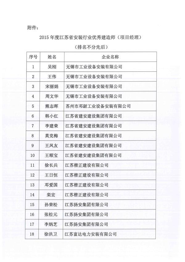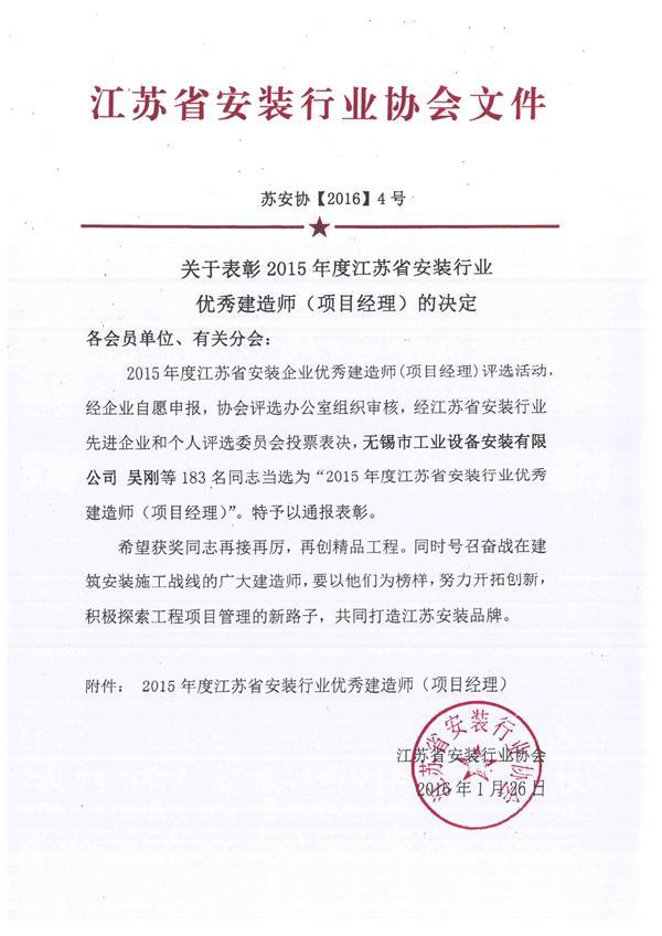 关于表彰2015年度江苏省安装行业优秀建造师(项目经理)的决定
